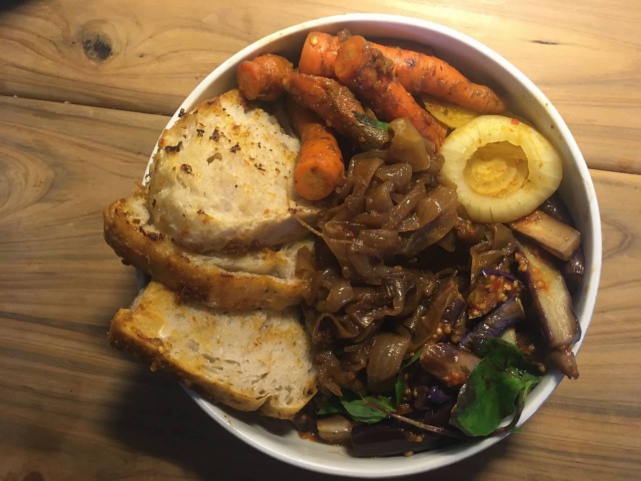 今天的晚餐很特別。我參考了 Bon Appetite 的 Youtube 節目 It’s Alive 主持人,發酵廚師 Brad 的食譜,用上次的發酵番茄做了一個無敵美味的醬汁。它的味道類似南美洲人喜歡吃的番茄洋蔥莎莎醬,只不過少了番茄。將這樣的醬汁淋在煸炒茄子以及紅蘿菠上,再搭配兩種洋蔥(味道濃郁的焦糖洋蔥和用吃完的酸黃瓜剩下的水醃的酸黃瓜洋蔥)。我必須說,使用發酵食物料理的西餐,真的能讓整頓飯的質感和口味提升好多好多。