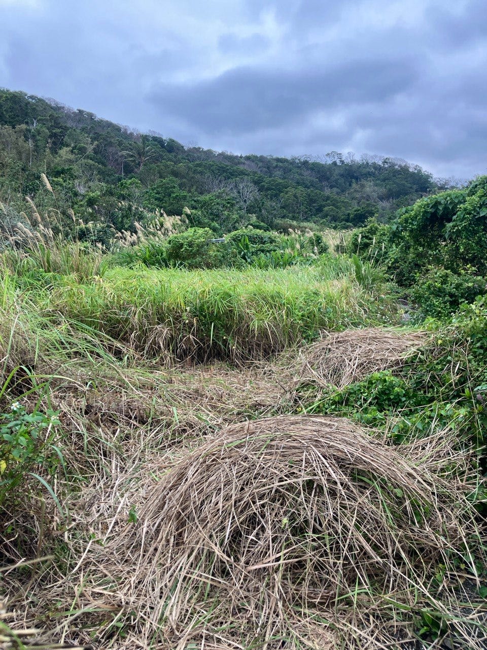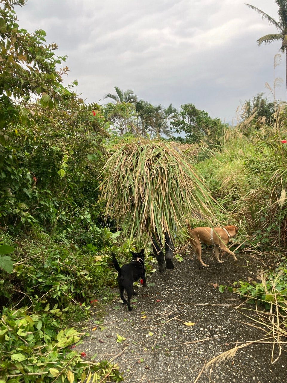 冬天我住的區域是旱季,不過在往北方半小時車程的Kakoting填區這一帶,一月的時候總是飄雨,濕氣很重。因為即將要整地,我們趕在農曆年前沒有下雨的時候進田裡收成。大苑總是可以帥氣地扛一大把茅草。