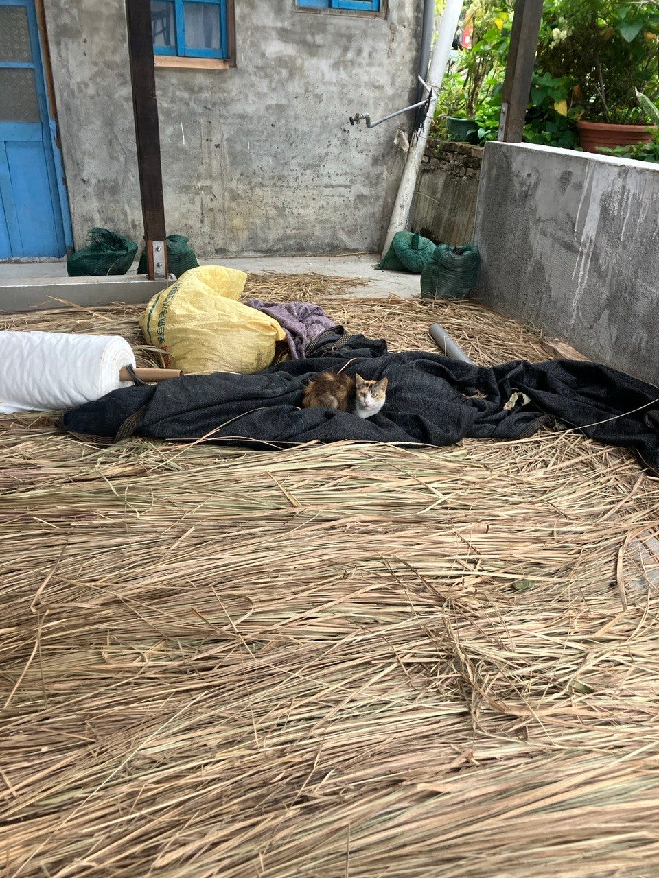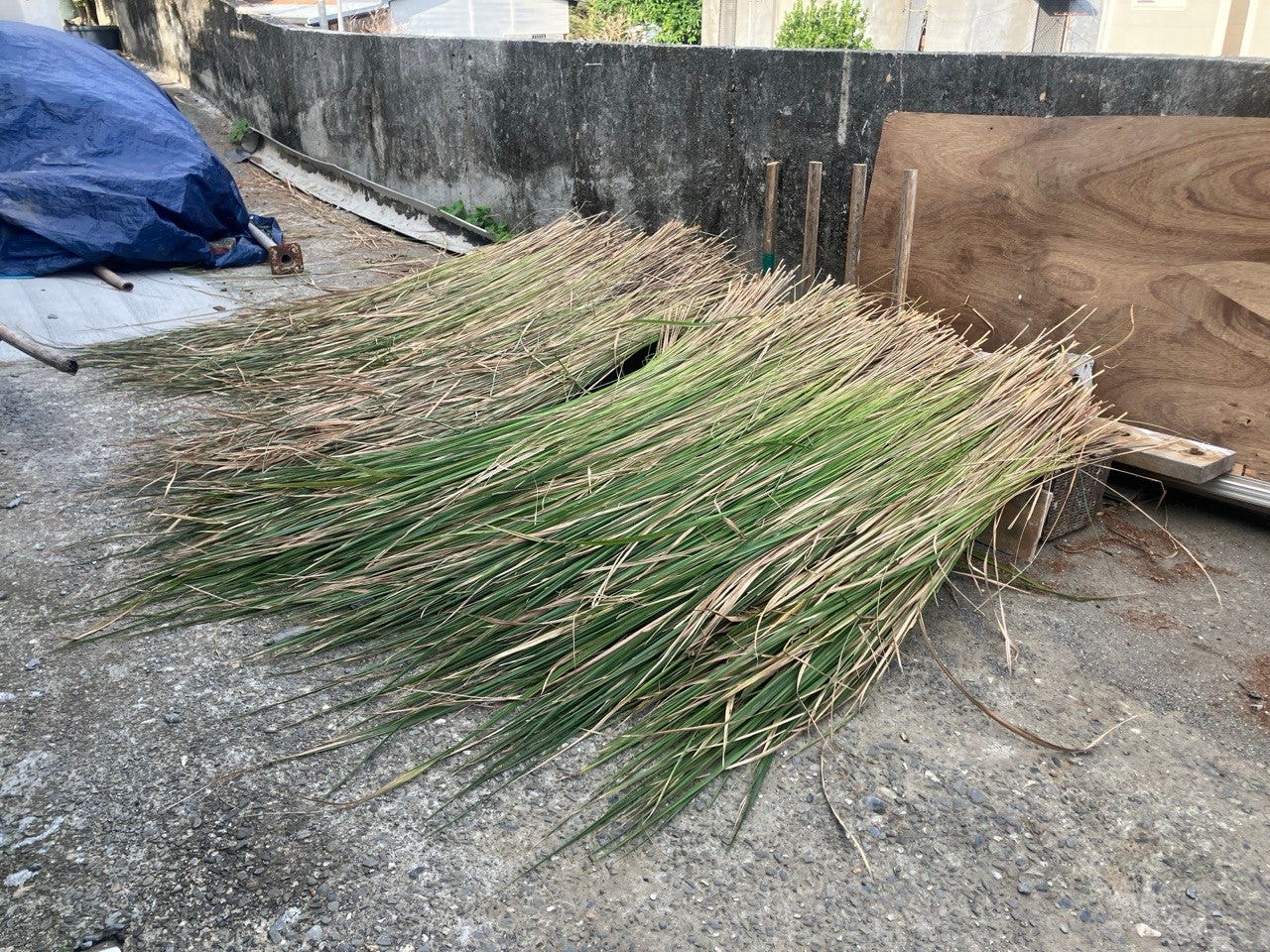 因為都沒有出太陽,所以把茅草放在綠屋頂下陰乾。把茅草攤開來,每幾天翻面。最終我和大苑收的茅草大概是都歷茅草產地茅草的量的四、五把?雖然不多,但還是很有成就感。