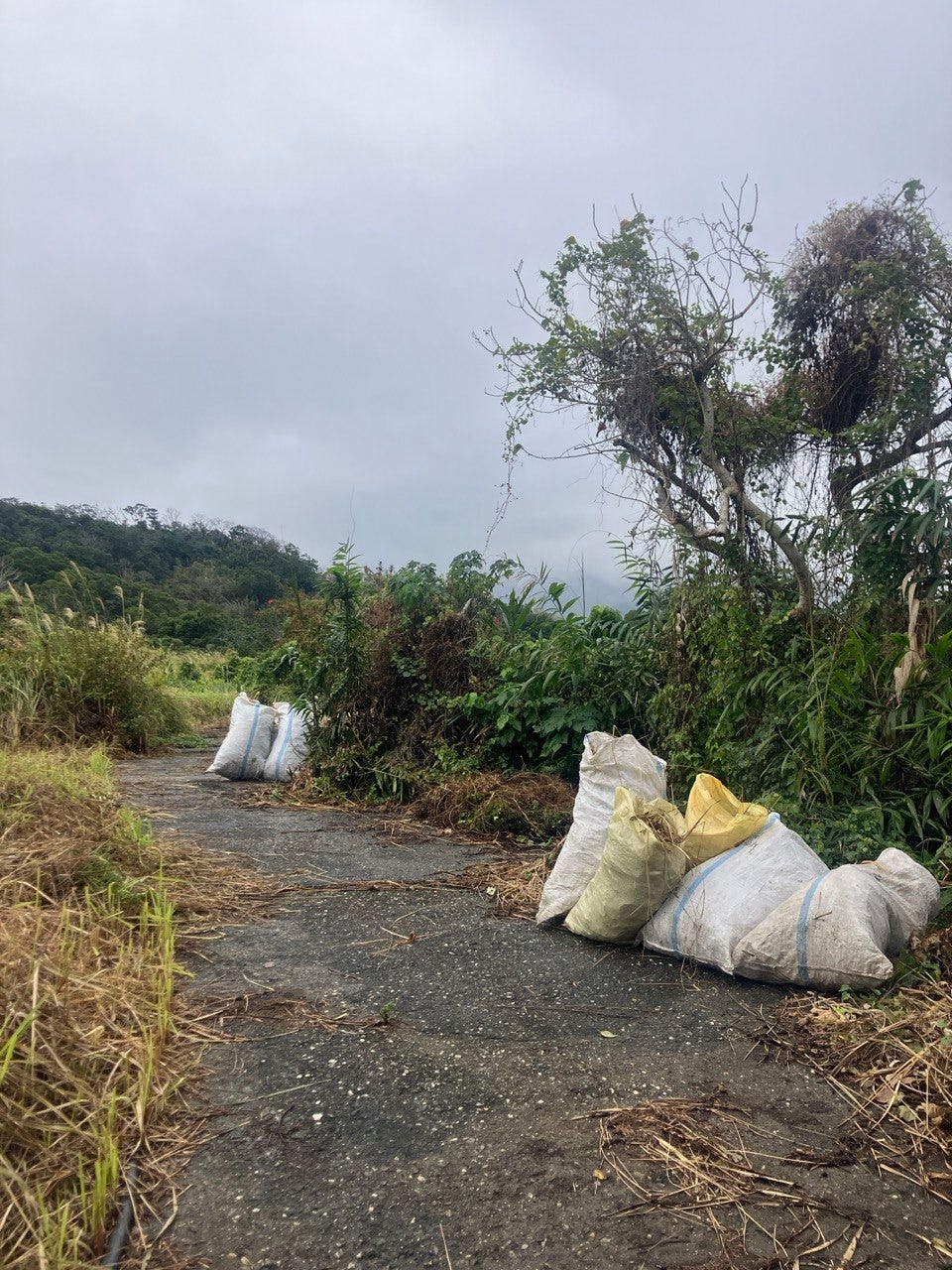 把進去茅草田區的道路旁的其他有機質整理出來並裝袋,剛好可以用於新蓋的綠屋頂上。