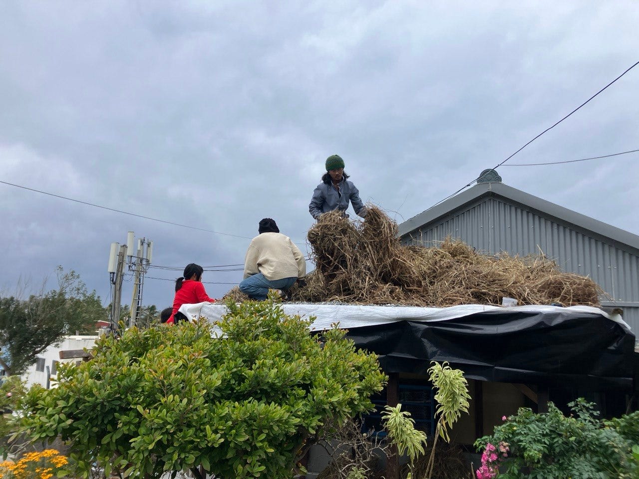 開工前一個月的某天,有四位朋友來換工與幫忙。我們先將茅草依照長度分類,因為茅草上屋頂時也會依照不同地方的功能使用不同長度的茅草。如果沒記錯的話,屋頂下沿會用到比較短的,越上面草的長度可以更長。