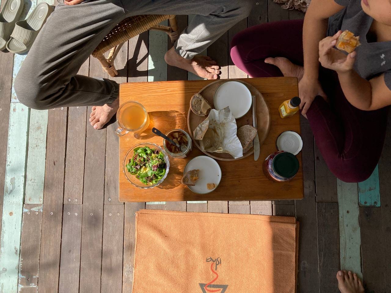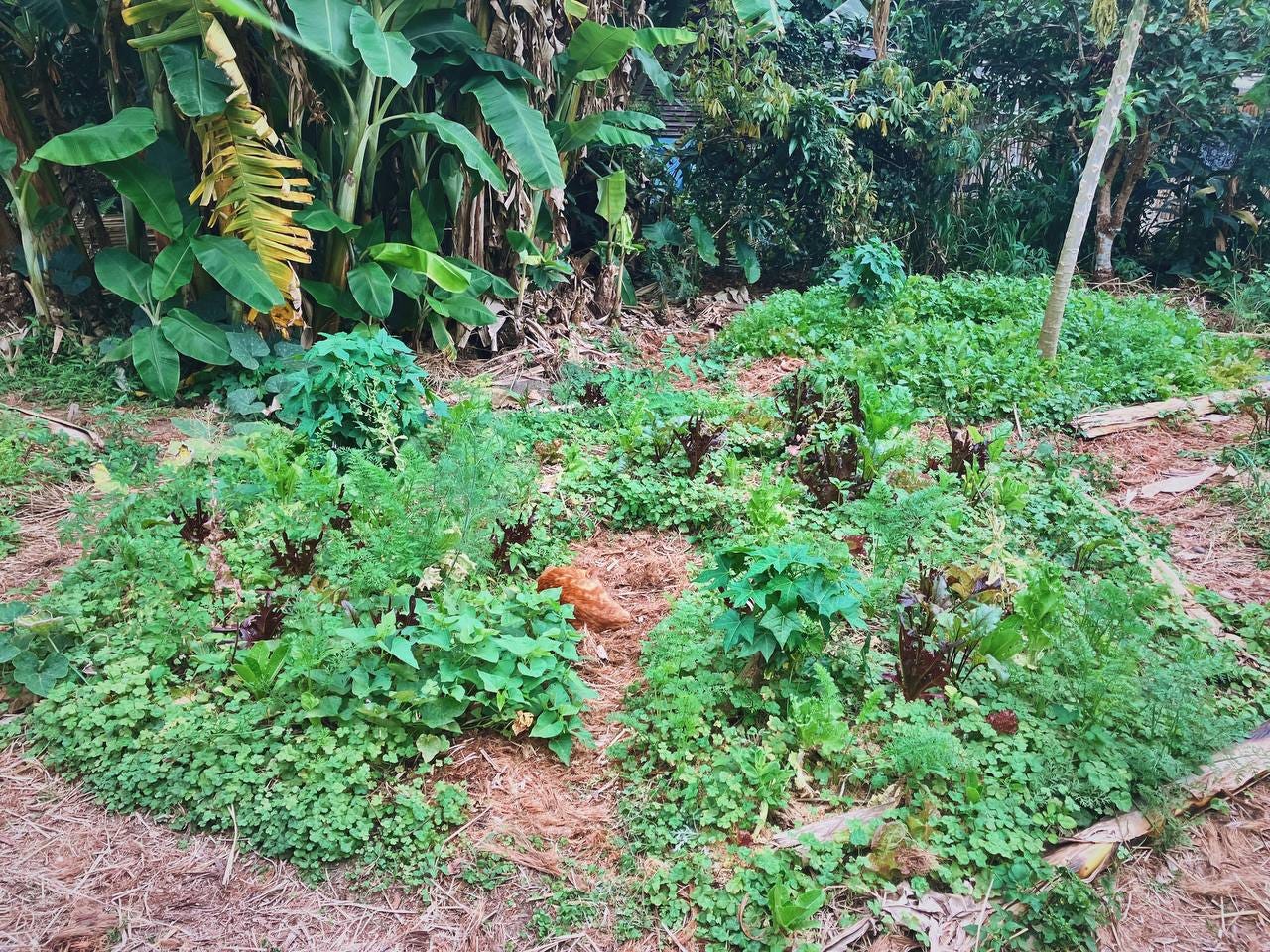 最近各種葉菜大出,我的鄰居大地旅人樸門教育基地裡也生長著各式各樣的食物。旅人們長年使用移動式雞籠管理二十幾個六角形鎖眼菜園3,除了萵苣以外,還有根莖類、香草類和茄科(鐵定還有很多我沒寫到的)食物。其中甜菜根葉子、紅蘿蔔葉子、康復力等都很適合生吃。