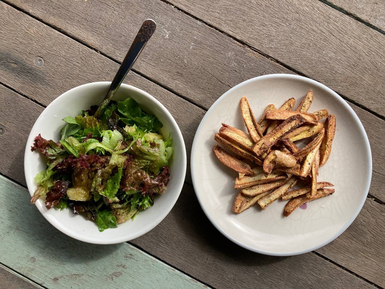 再來才是酸和甜味。如果家裡沒有經典的紅酒醋(balsamic vinegar),在沙拉裡加百香果或是任何一種柑橘都可以完美取代醋。這是我姊姊特別喜歡的作法:在一盆沙拉裡加入一顆百香果,或是擠兩手柳橙汁、一點檸檬汁,再加一點蜂蜜增加甜味。剛好台灣的秋冬也是柑橘的產季,油醋醬的醋可以大方用水果來代替!不過切記酸甜的味道絕對不能太多。比例上要少於油的用量。這樣子整碗沙拉才不會泡在水中!水果、新鮮辛香料、溫的食物