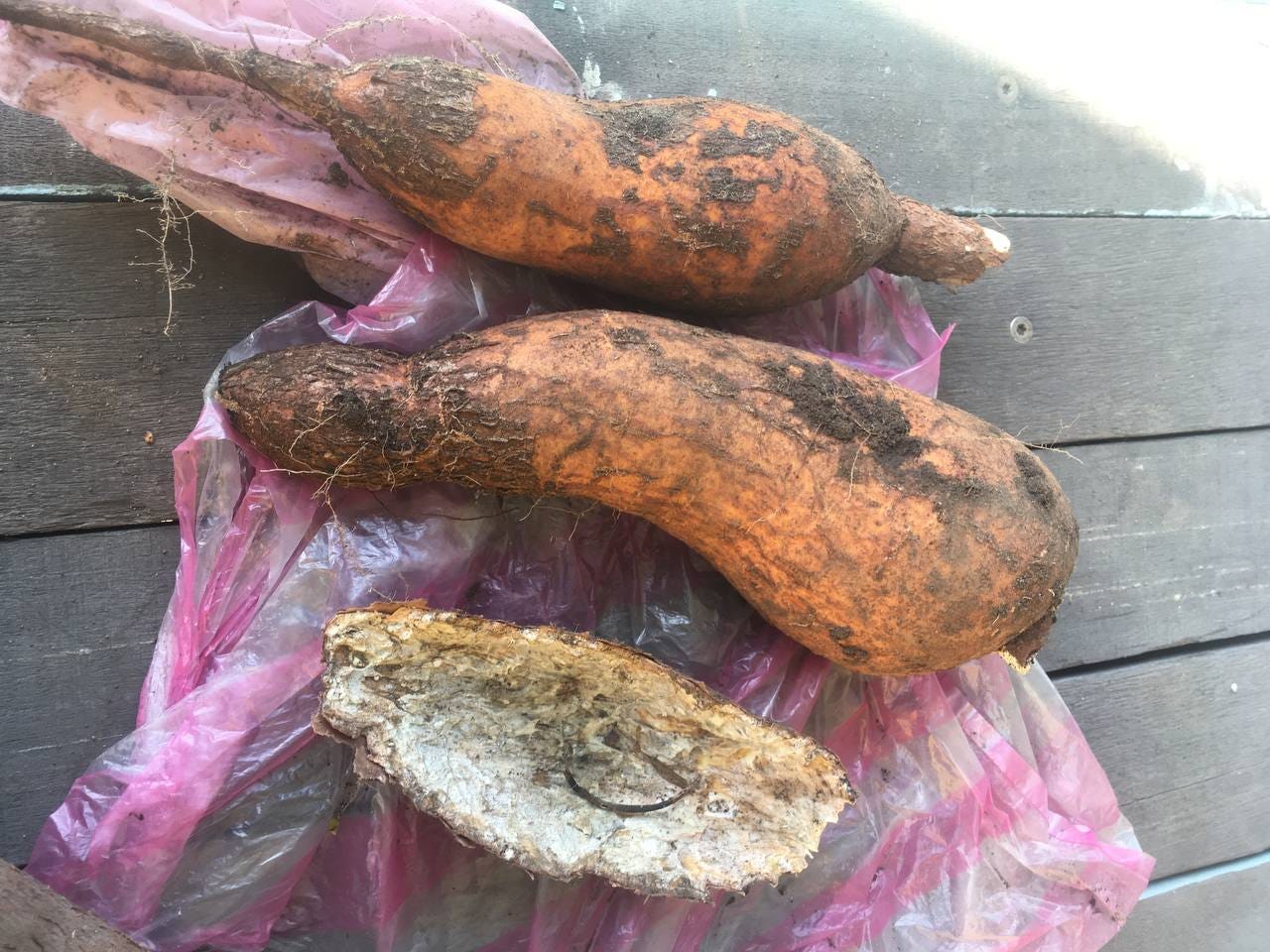 每年春天,我有空就把一些樹薯剝皮、切塊後把裡面的心撥出來再拿去蒸熟。之後再乾煎成樹薯條(yuka fries)!我會一次把幾棵樹樹處理好切塊後放進冷凍保存,不過這陣子冷凍太滿了,實在無法放下所有的樹薯。所幸塊根型的食物本來就耐放,再加上樹薯的皮那麼厚,更不容易腐爛。