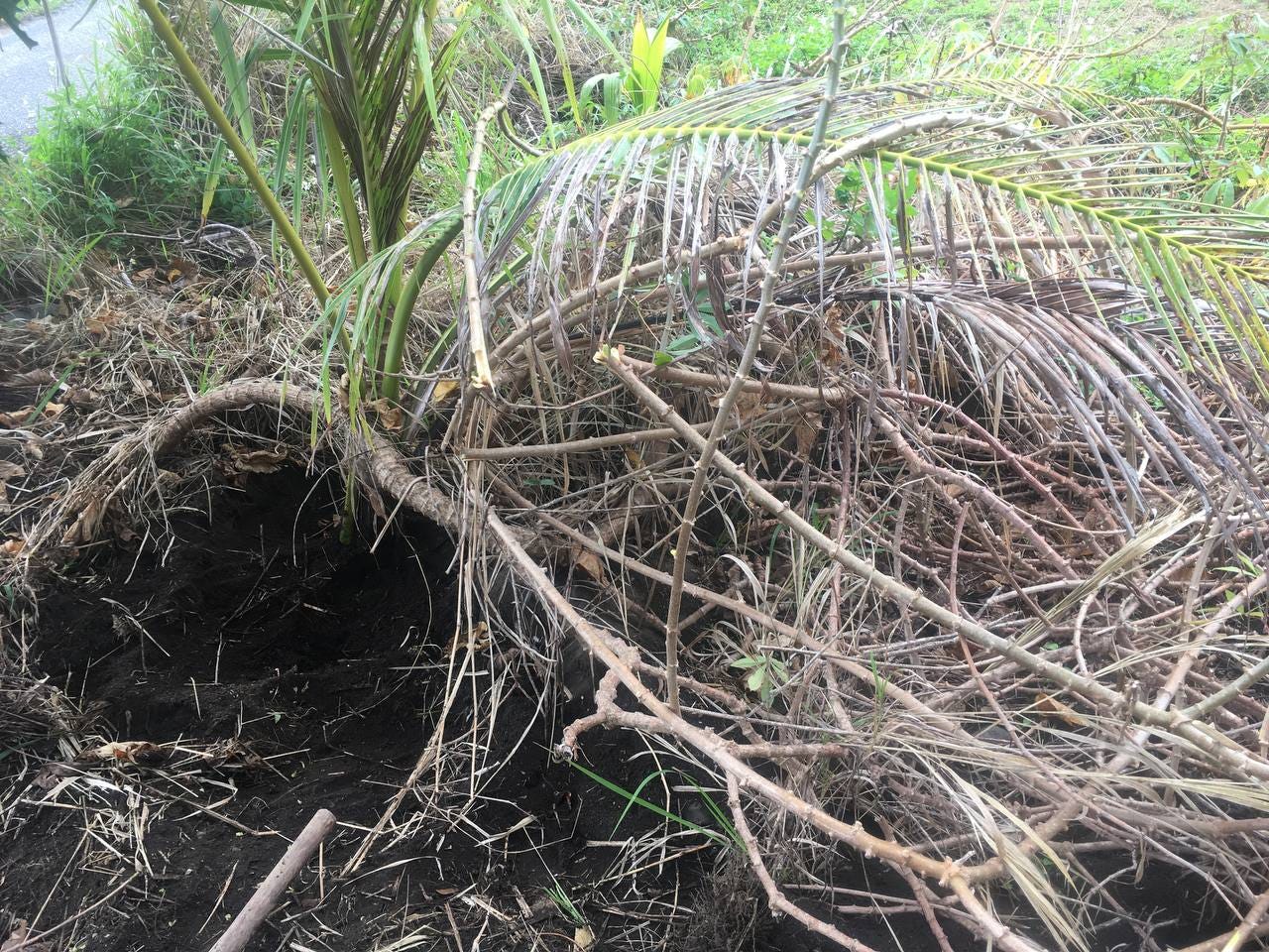 那個時候忙著寫論文,也沒有種其他需要好好照顧的作物,所以就先把這件事擺一旁。直到前幾週,路邊那區已經種植兩三年的樹薯開始大量掉葉子,巡一下邊界,又發現一旁我寶貝照顧了一陣子、剛種進土裡沒幾個月的馬來巨竹突然死掉,我才嚴肅的開始思考,並在網路上稍微研究一下這個問題。